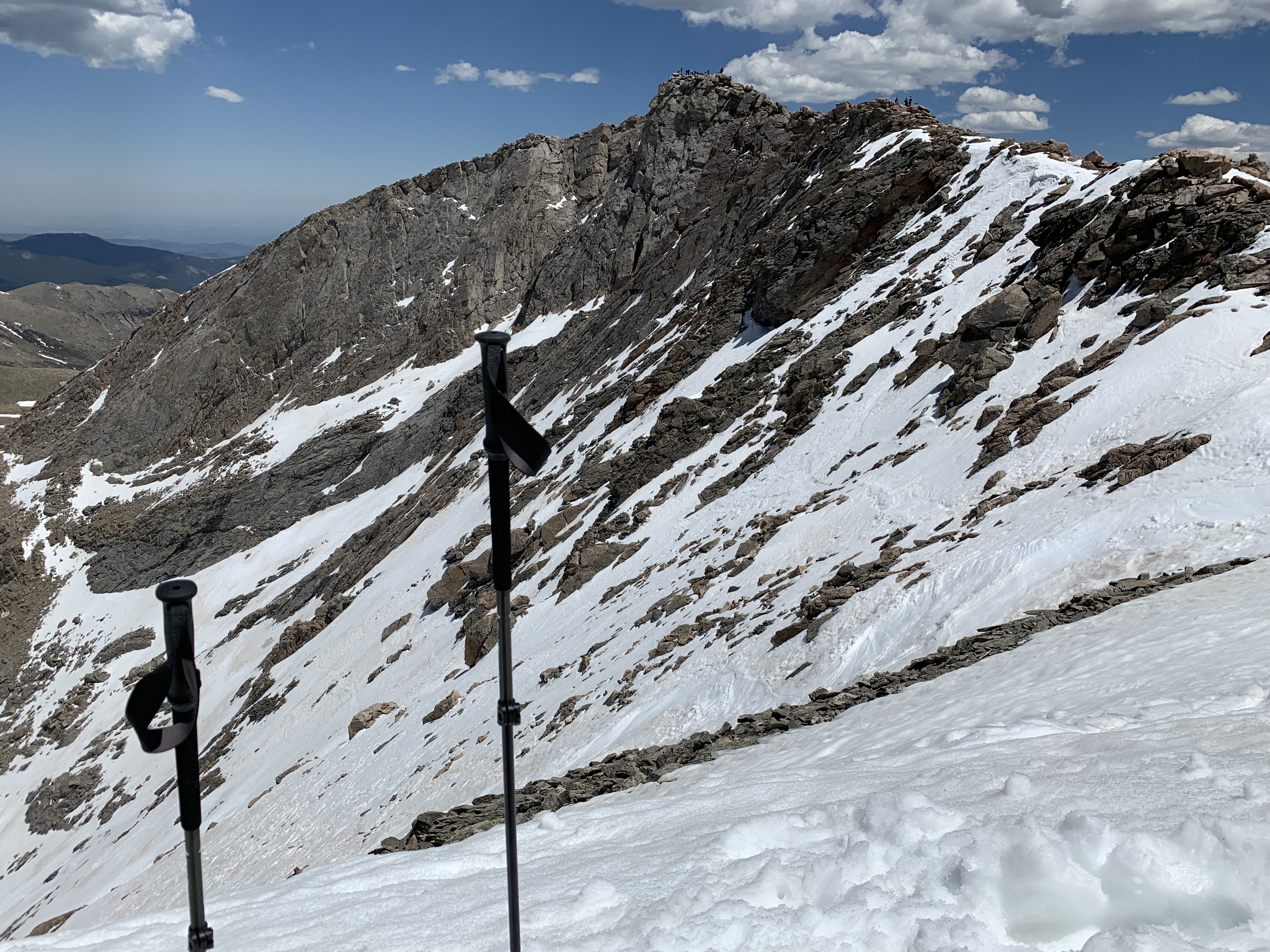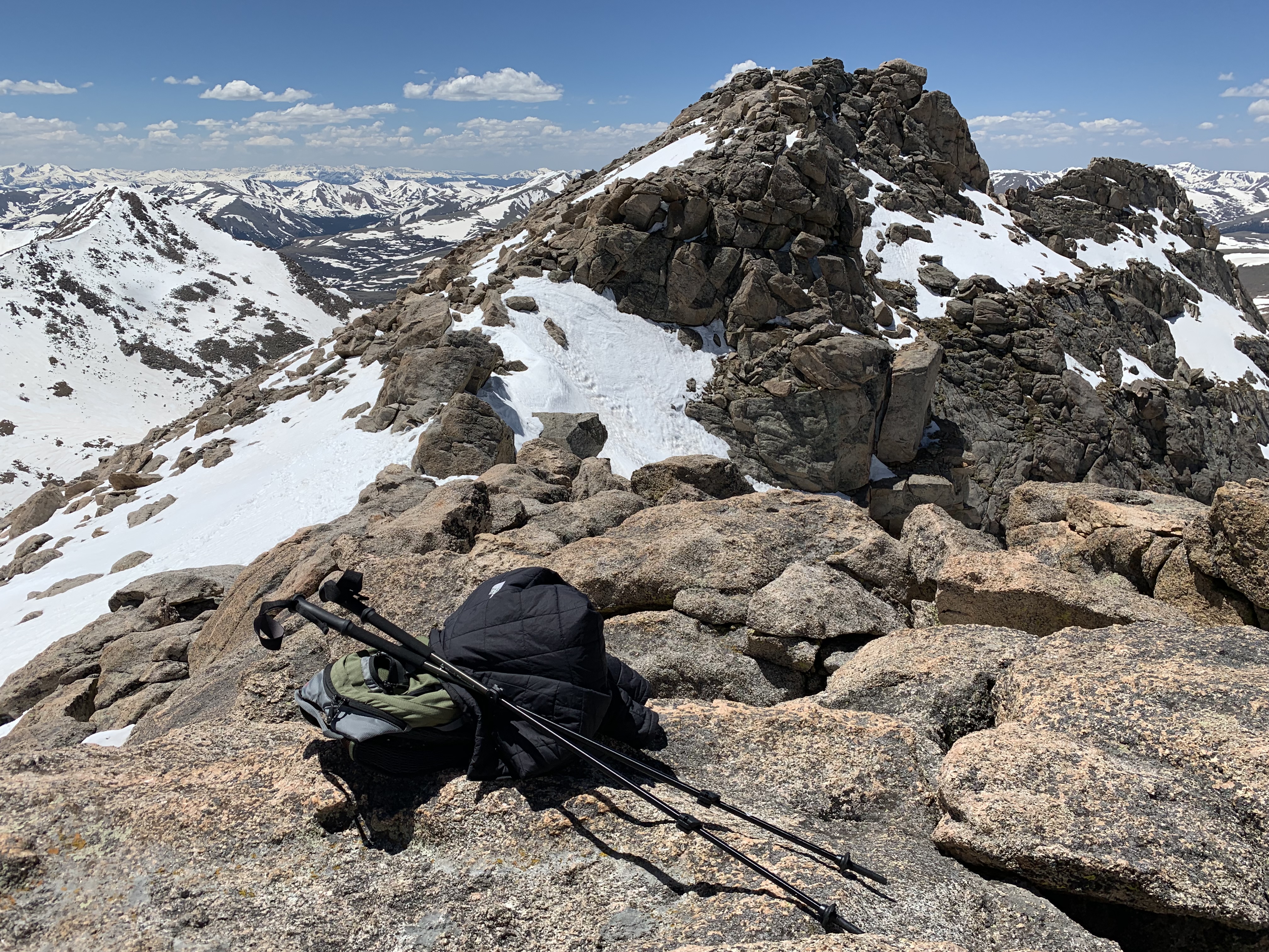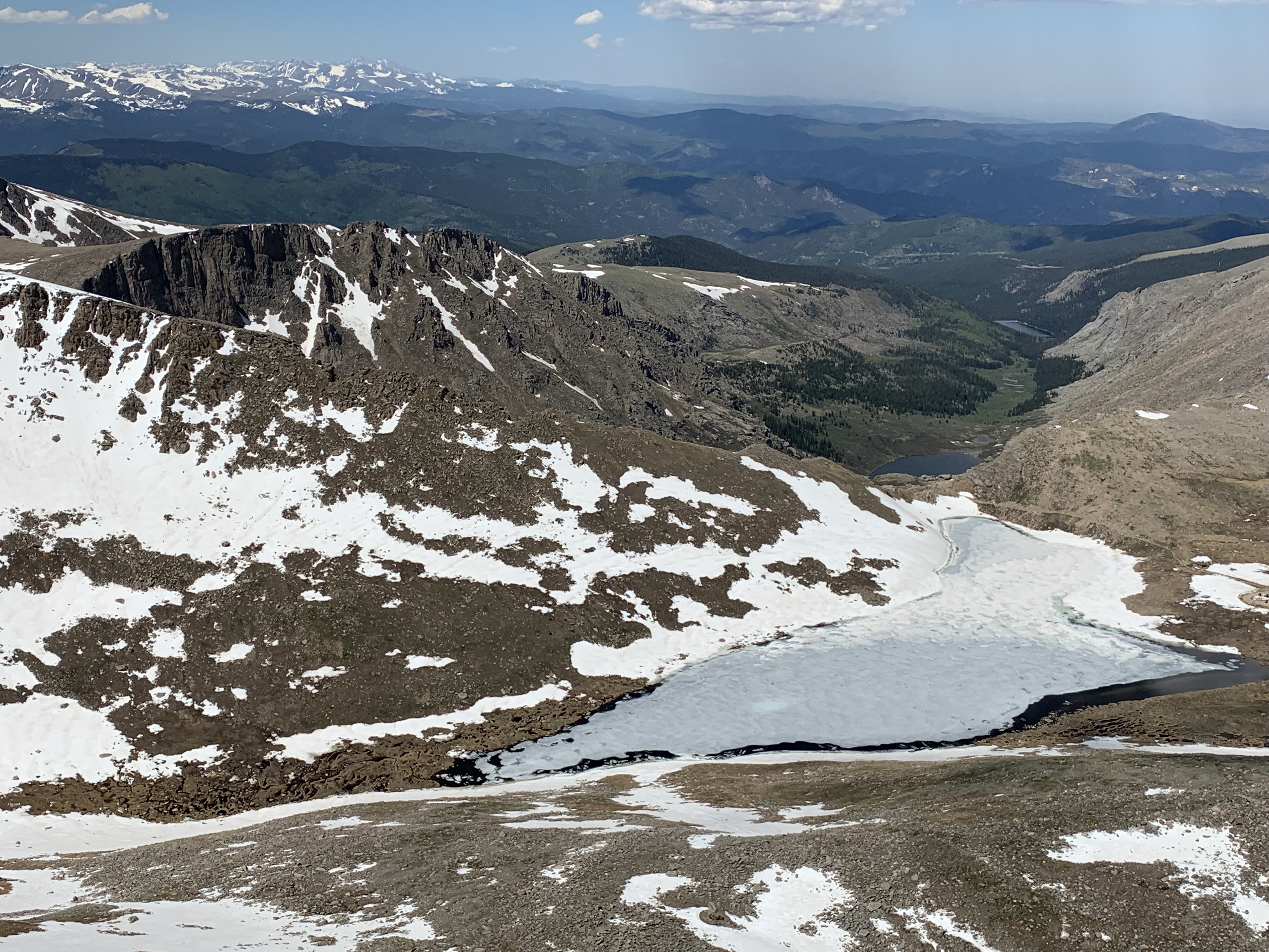 It was quiet on the mountain. The wind was unusually still for much of the day and there was little human activity around me. The quiet of the air was contrasted heavily by the loudness of the visuals. Snow-capped mountains could be seen all around, their illuminated white luster slightly fading out into the hazy distance. Two partially frozen lakes could be seen down in the valley, showcasing a variety of beautiful blues that come with the thawing ice. There was a pervasive slight trickling of water that could be heard on the trail, as the summer heat was slowly melting the thick mounds of ice and snow still clinging to the rocks at the top of the ridge. Several little streams were making their way down the mountain.