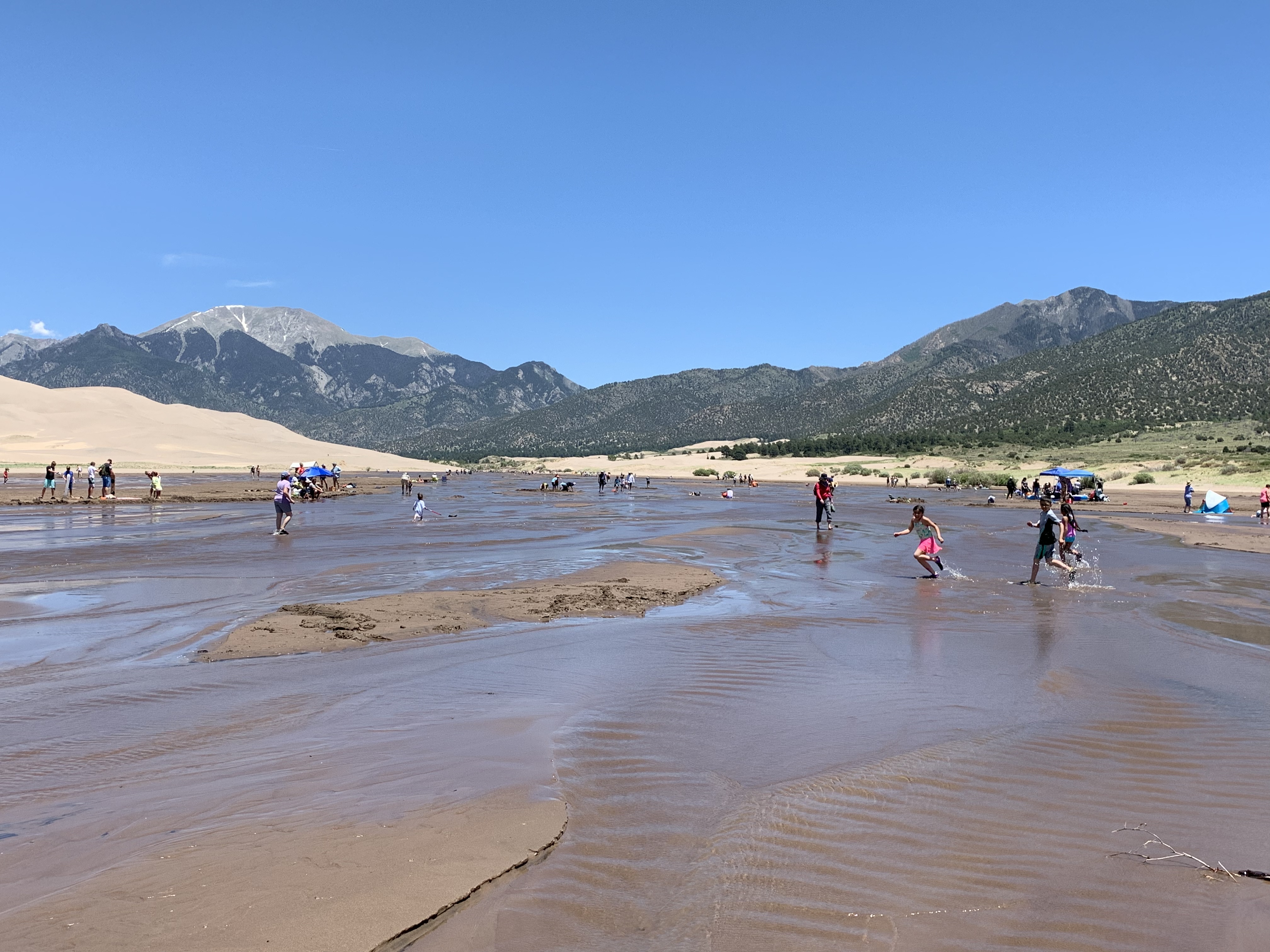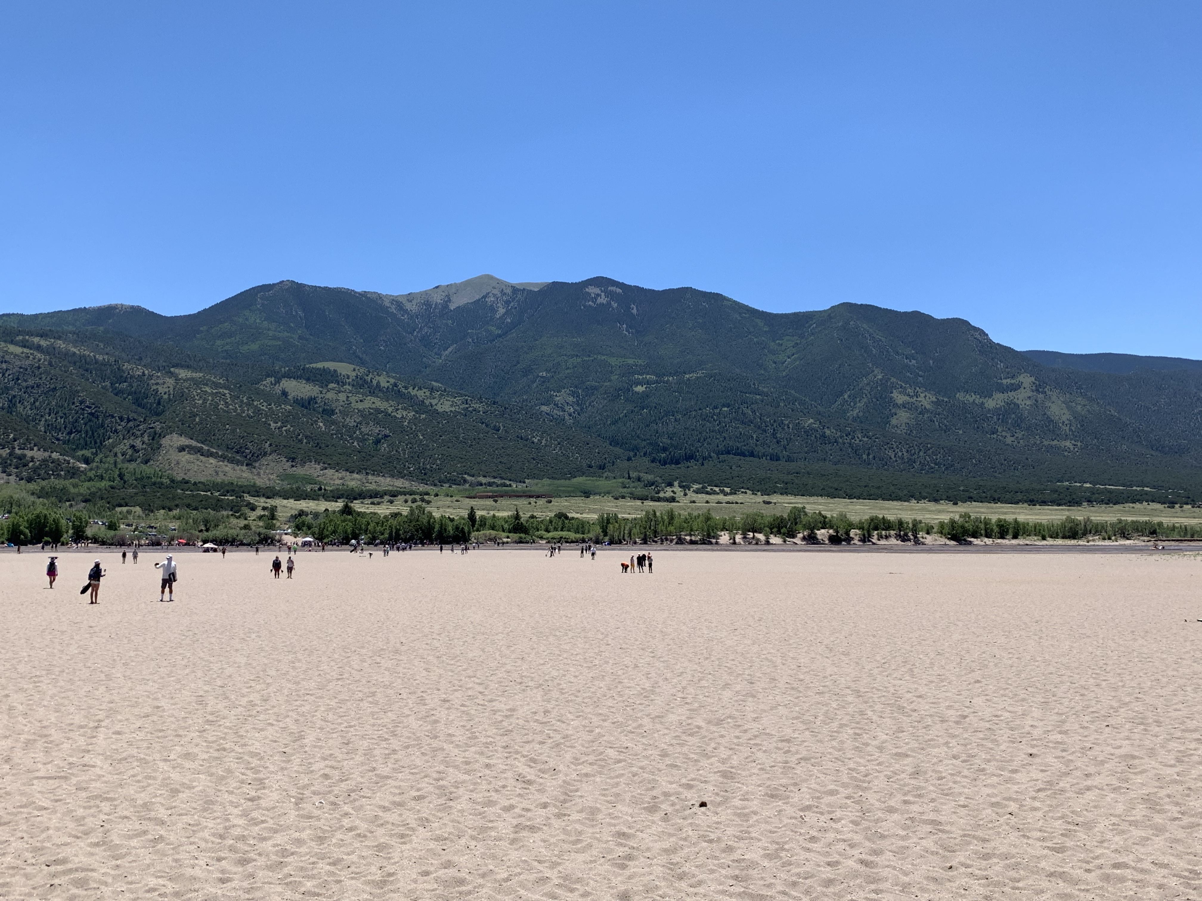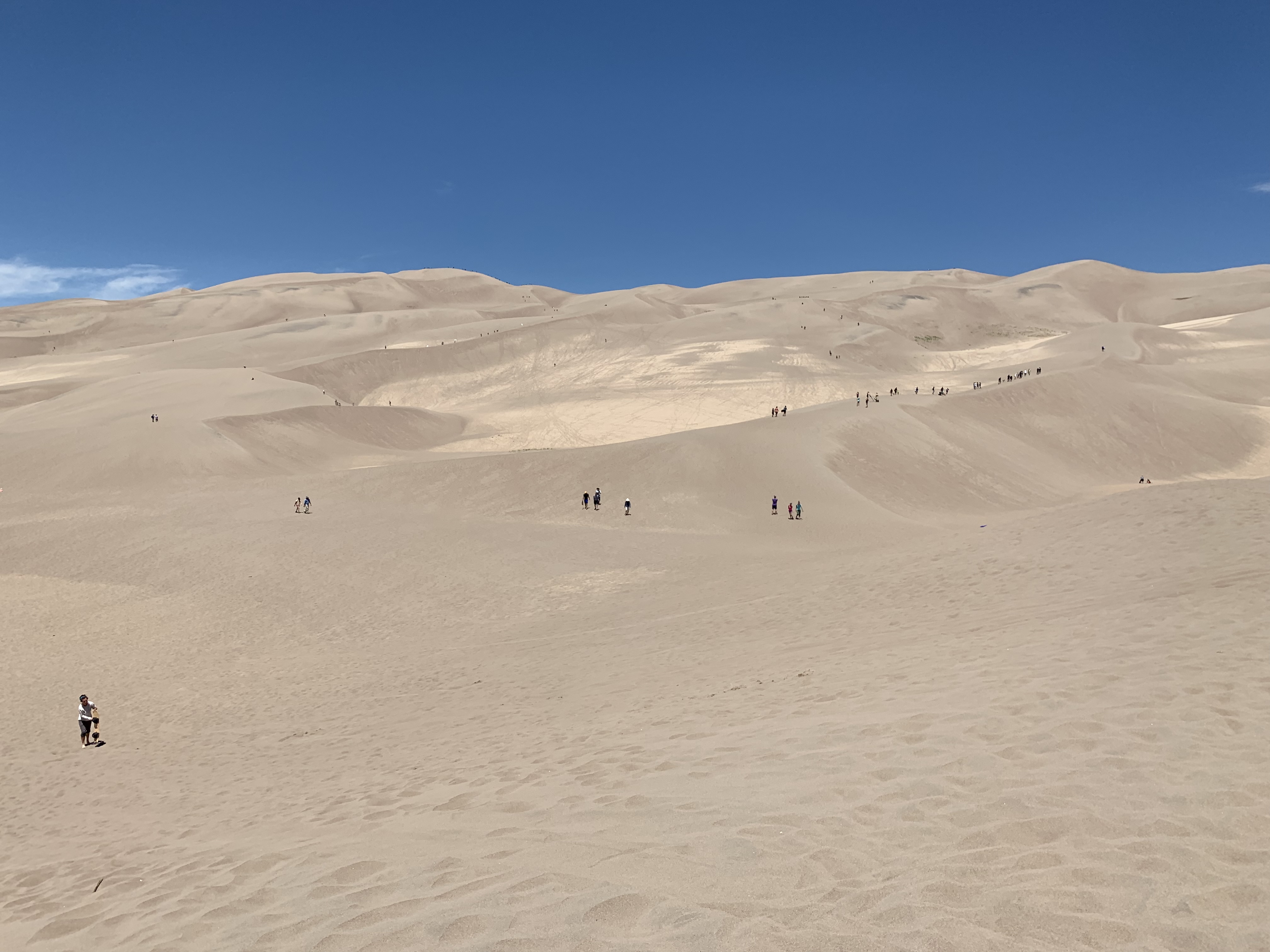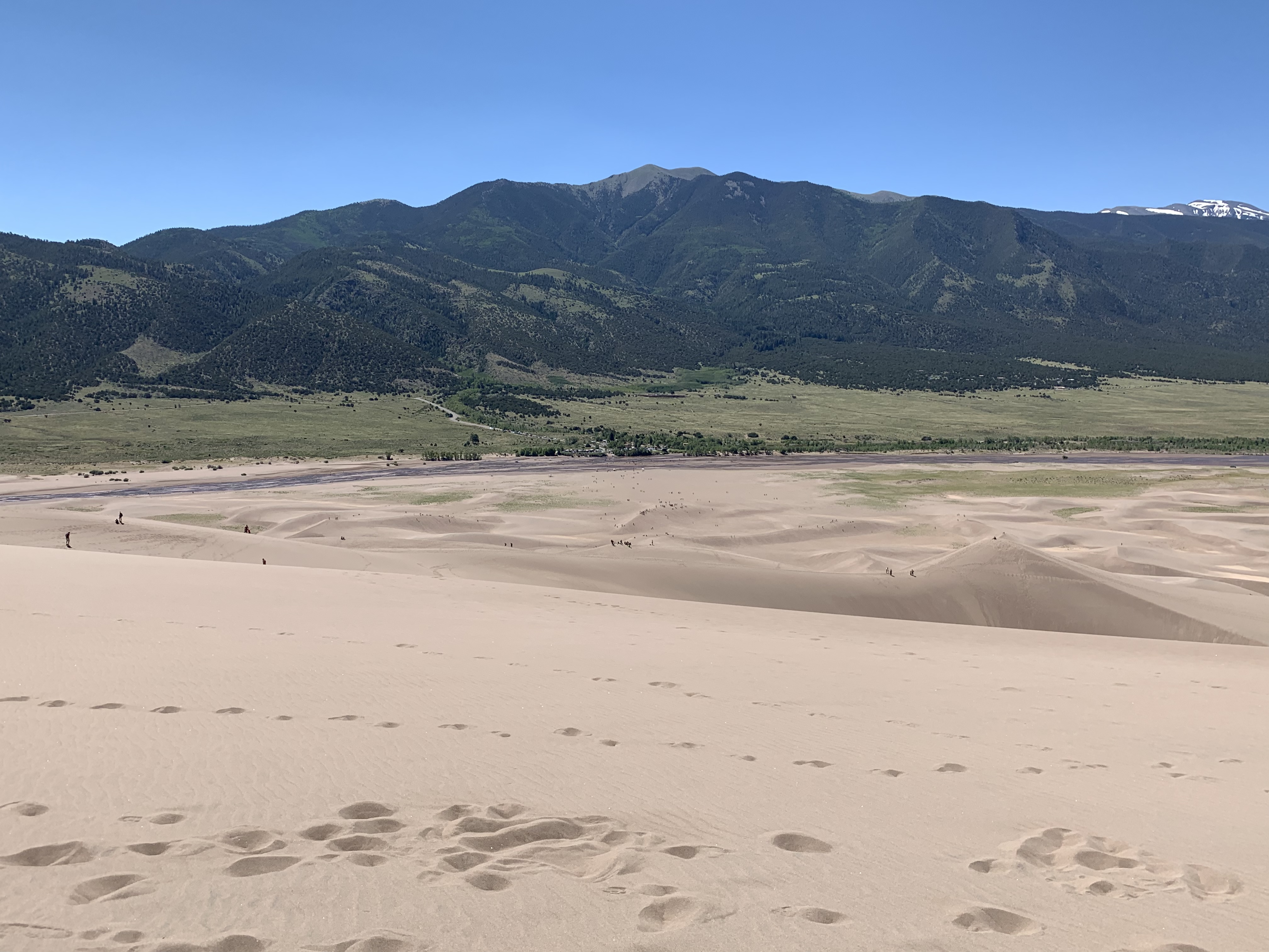 I made it to High Dune around noon. From High Dune, I got a view of the entirety of the dunes, along with the San Luis Valley and the surrounding mountains. I was awestruck by the view and simply sat in the sand for a few minutes gazing out. I took my shoes off and sank my toes into the sand. The deep sand was cool and yielding and I felt a renewed sense of connection to the land. It was intimate and engaging and I sat at the top, without thought, simply letting my awareness take me to new heights. It was a fleeting kind of heaven on that lone hill of sand and I made sure to breath in each moment to its fullest.