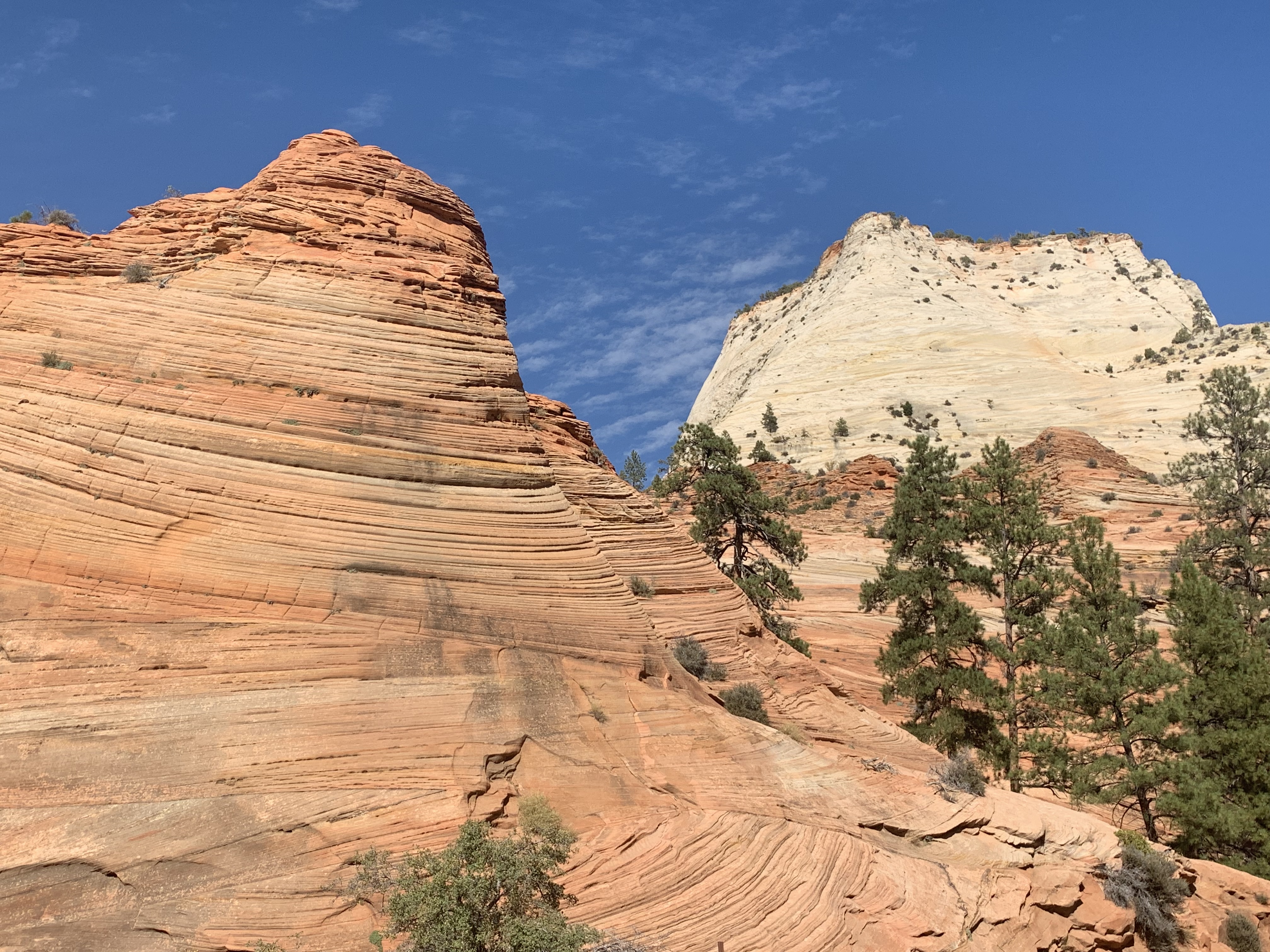 Learning about the geology of the land always intrigues me. There are 270 million years of exposed rock layers dating back to the Triassic period. There are basalt deposits from volcanic activity and lava flows that solidified. There are siltstone layers from past river systems and ponds. There are limestone layers that tell of a sea. But what sets Zion apart from any other canyon is the top layer of Navajo sandstone that has been exposed to light. This striking layer of sandstone is almost white and sits at the top of most of the cliffs in the canyon. When the morning sun hits it, it glistens and illuminates in the most entrancing of ways. As you look up at it from the canyon floor, its radiant glow and textured flow make it seem like another world entirely, like some unattainable, blissful realm. Trees dot their wavering, sloping angles, giving you a reference point for the sheer size of this heightened, illustrious rock.