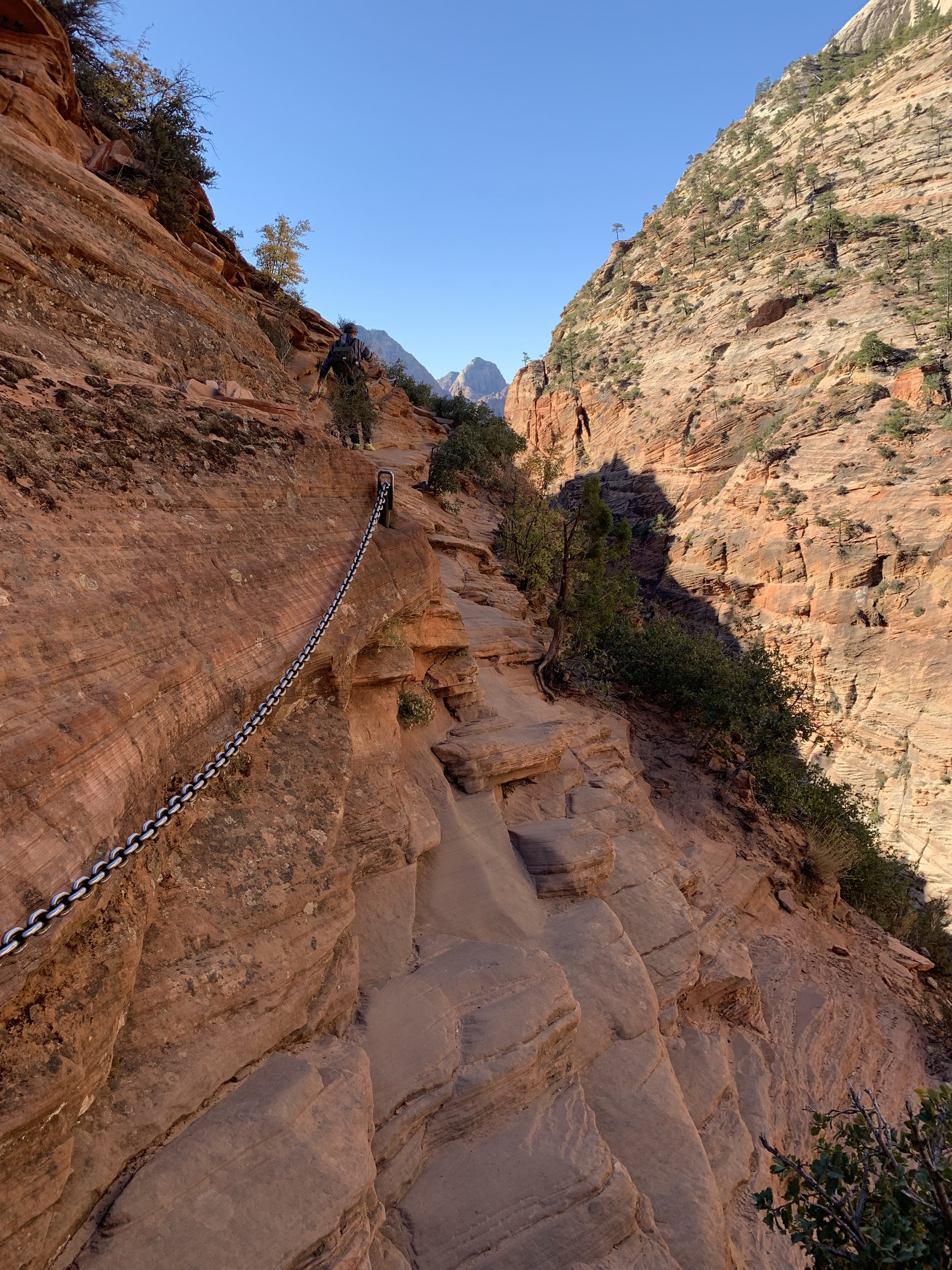 As I continued, a part of the trail goes into a narrow corridor between the canyon wall and the rocky outcrop of Angel’s Landing that I would be climbing. As I hiked, I could hear faint echoes of distant voices from hikers around me. The muffled sounds dissipated into the air over time and it suddenly made me think about how fleeting our lives are. We come and go as quickly as the muffled voices fade into the sounds of the distant wind.