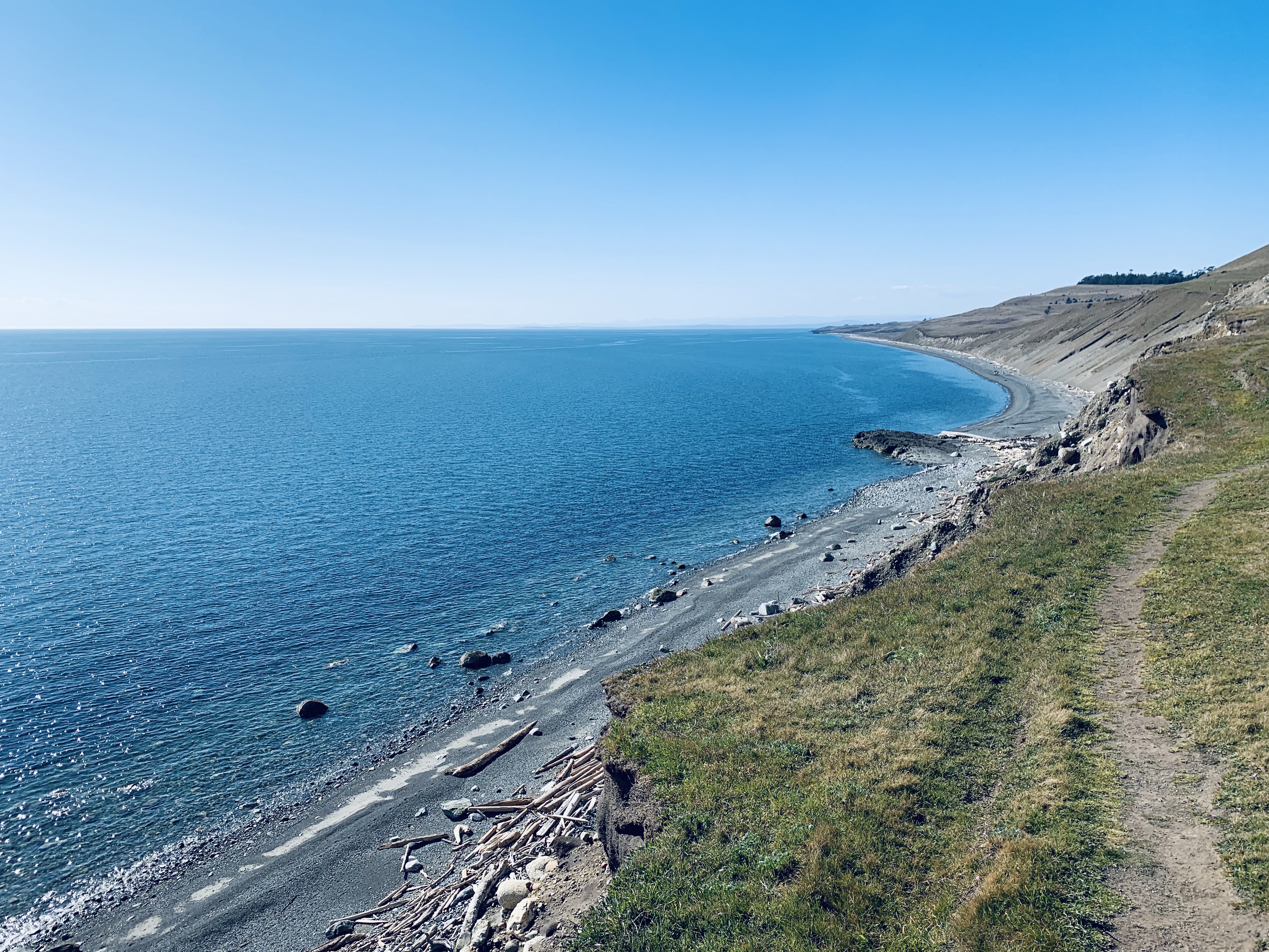 I drove down to the Southern edge of the island in the early afternoon. There one can walk along the high grasslands overlooking the dramatic, rocky cliffs that lead to the distant shore below. Across the water, the brilliant Olympic Mountains can be seen. That afternoon, the way the fogs had gathered at the base of the range and the particular way the sun was highlighting the peaks, the mountains almost seemed to exist in a realm all their own. They were a heavenly backdrop as I walked along the trail on the cliff edge. Occasional gulls and even a couple of eagles flew overhead curiously checking me out. As I got down to the shore, I found that the occasional harbor sea would poke its head up out of the water to do the same thing. What a wonderful diversity of life to be caught up in I thought to myself.