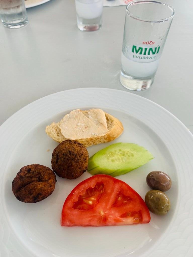 The island consists of 10,000 inhabitants scattered about its various villages. One of the villages we visited was Ano Mera. This was a quaint, homey little village with narrow cobblestone streets winding through cafes, shops, bakeries, and taverns. Many of these stops had outside terraces for sitting and basking in the hot, sunny late spring weather. We sat down briefly at one of these cafes and enjoyed a light snack of hummus spread, falafels, assorted vegetables, and olives. We were also told to try the local Ouzo, an anise-flavored white opaque liquor popular in the area. It is usually diluted with water, as it is very strong and biting on its own. The drink was alluring and aromatic, with a strong licorice flavor along with other flavors that were utterly foreign to me but pleasant and inviting. The bite of the drink was an assault on the mouth, as our samples seemed minimally diluted, but the warming spirit of the drink was still like a charming hug from the people of the island.