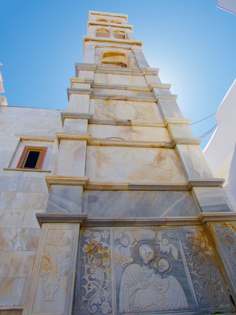 Standing tall above the village square was a 16th century monastery, the Panaqia Tourliani. This was the obvious focal point of the village, with its marble façade and belltower hanging over the square with a glorified dignity. There were chiseled images of religious figures and intricate woven patterns on the outer surface of the bell tower leading the eye up to the stacked columns and arches making up the top. The bells could be partially seen through the space created by the arches, hanging like songbirds in an elevated cage, waiting to bellow out their songs and chants to the masses below.
