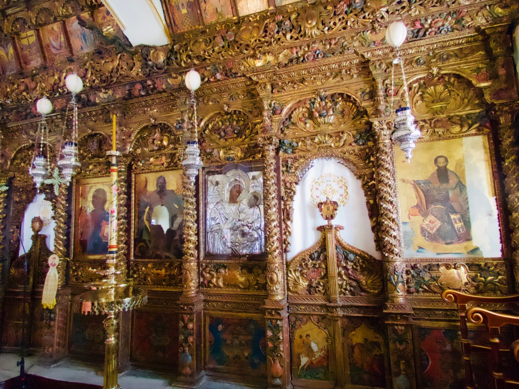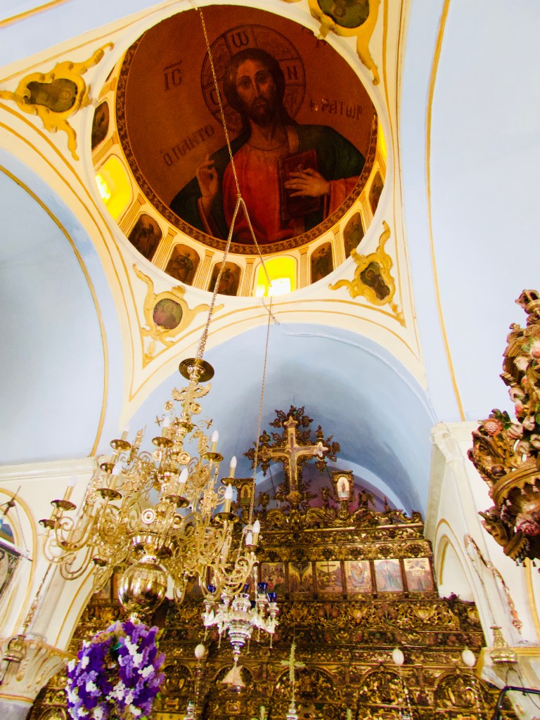 The interior of the monastery was even more striking. Golden chandeliers hung from the ceiling with equal parts beauty and complexity, interspersed with hanging bouquets of flowers beaming with different shades of purple. Taking up the entire back wall of the monastery were wood-carved depictions of saints and apostles interwoven with cherubs, bowls of fruit, flowers, and fauna. The dome in the middle of the space had an Eastern Orthodox style depiction of Jesus, gazing down at his flock with a daunting aura. The glowing golden and reddish-brown hues of the inner dome surrounding Jesus gave the sense of the ethereal, like the dome was an actual access point between heaven and earth. The separation of the mundane and the holy created from this illusion filled me with both adoration and unease.