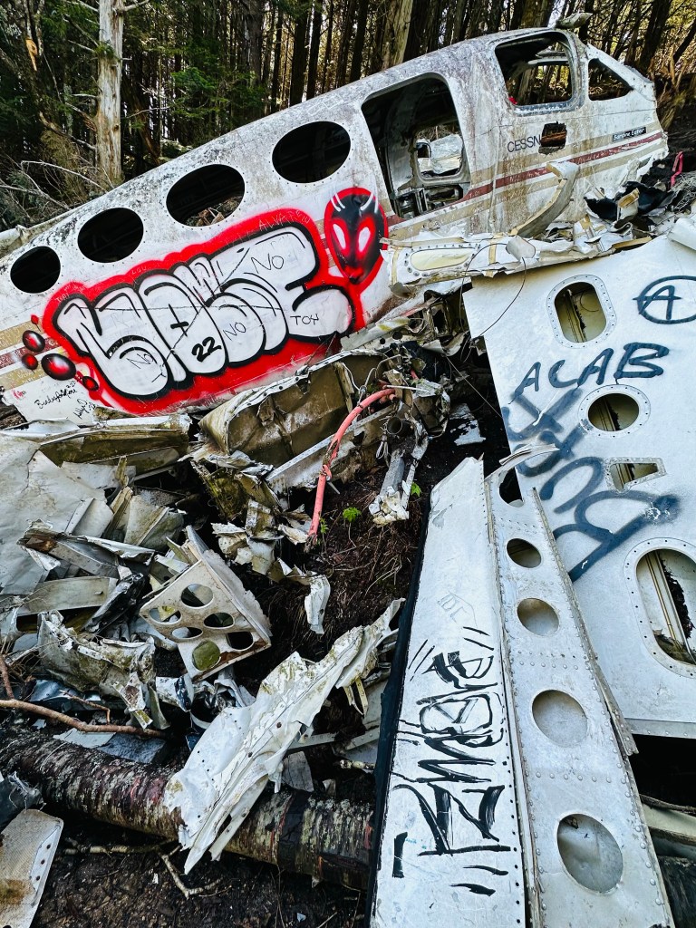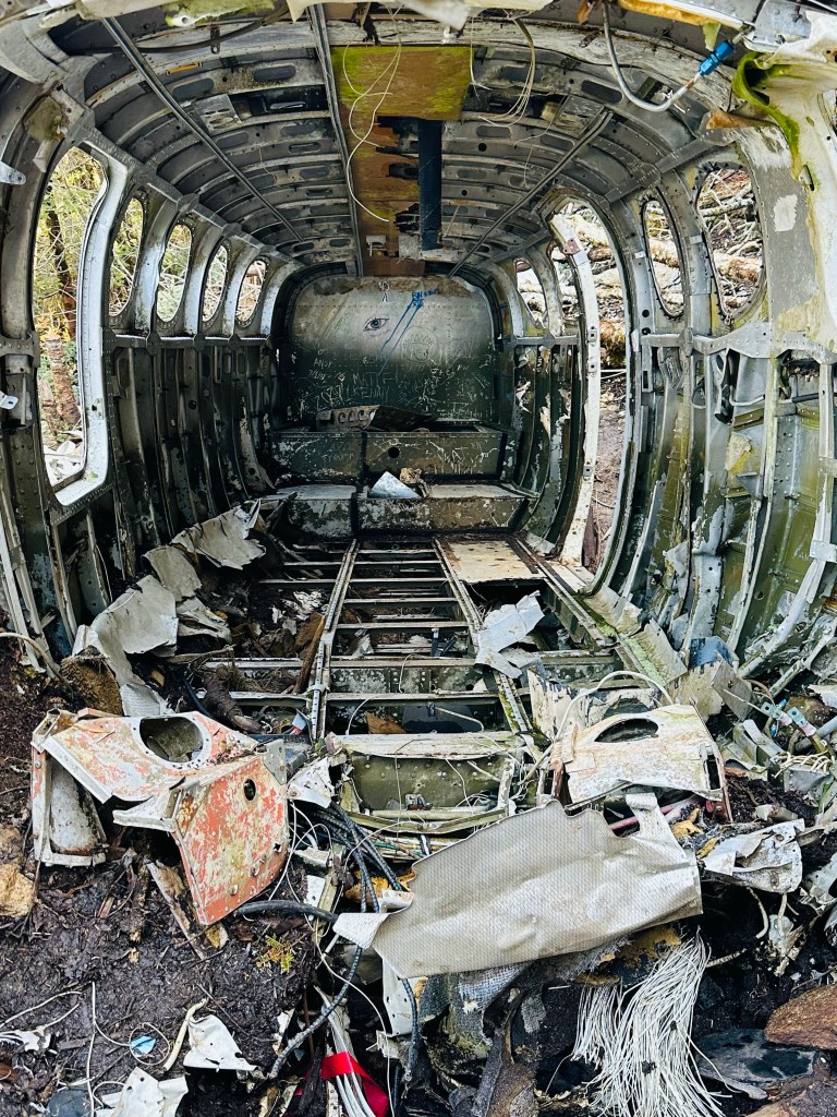 I had hiked early that morning, which I prefer because there are far less people roaming about versus the mid-morning and early afternoon. I had this place to myself for a time. I deeply appreciated this, because taking my time walking around the site and contemplating it was oddly serene and meditative for me. I find places of decay and ruin provoking and intriguing, especially something like this. I think it forces me to contemplate death and the finiteness of life. It’s invigorating and revitalizing knowing we are still alive, that we exist here and now among the wreckage. Its twisted metal, exposed bits of wire, and frayed upholstery were tarnished and weathered. The outer shell of it all was oddly illustrious though, with its white/silvery surfaces, almost gleaming against the backdrop of the greys, browns, and greens of the forest. It was like some holy shrine in a way, honoring life, respecting death, and grounding me in the immediacy of the moment. I couldn’t help but vigorously start taking pictures. I love photography, for one because it is a snapshot of a time and place that you can create and capture. But this was like a live, 3-D snapshot of one moment of devastation that leaves so much room for the mind to try to fill in the gaps and sift over the grisly details. We are the story creators after all.